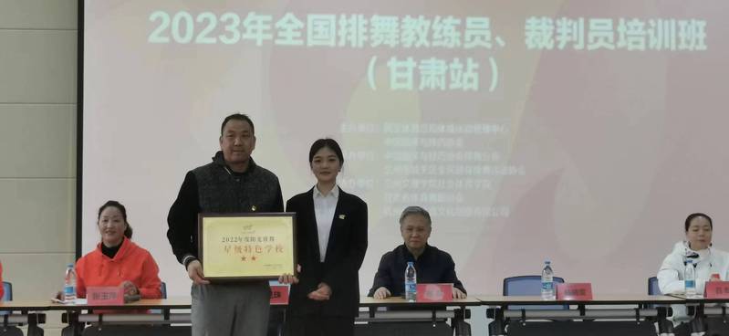 中国蹦床与技巧协会排舞分会事业发展部部长陆晓雯向公司授予“阳光排舞”进校园二星级特色公司铜牌;张玉萍教授在致辞中希望大家珍惜这次机会,认真从理论、技术、实践方面进行系统性的学习,不断提升自身技能,进一步提高教学水平和指导能力,能真正成为优秀的排舞教练员裁判员,积极组织队伍参加排舞、广场舞竞赛,以赛促推广,以实际行动推动甘肃省排舞、广场舞的发展。