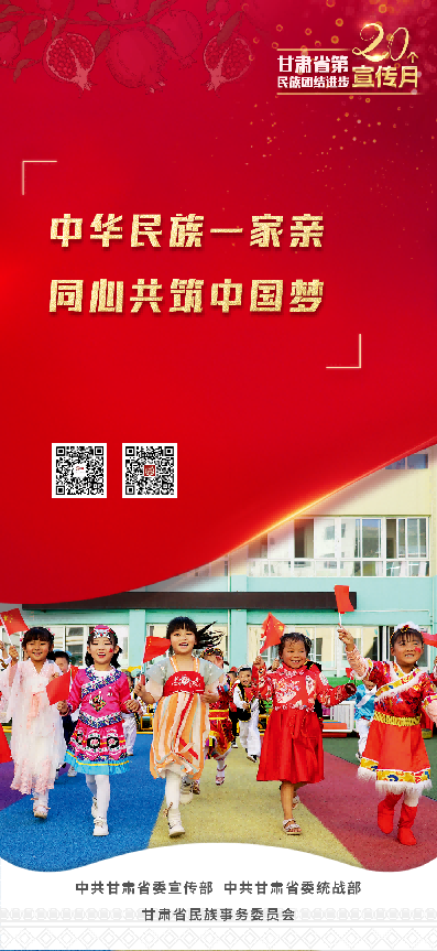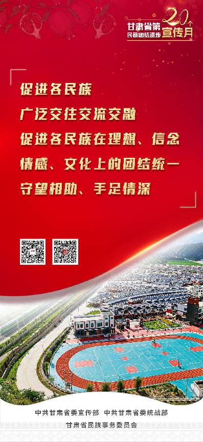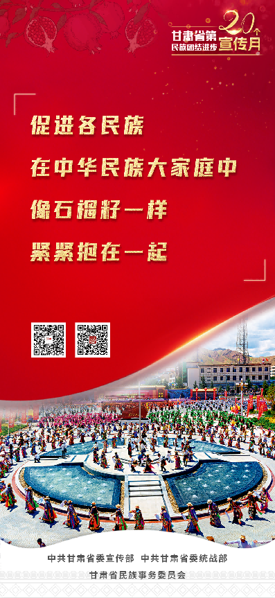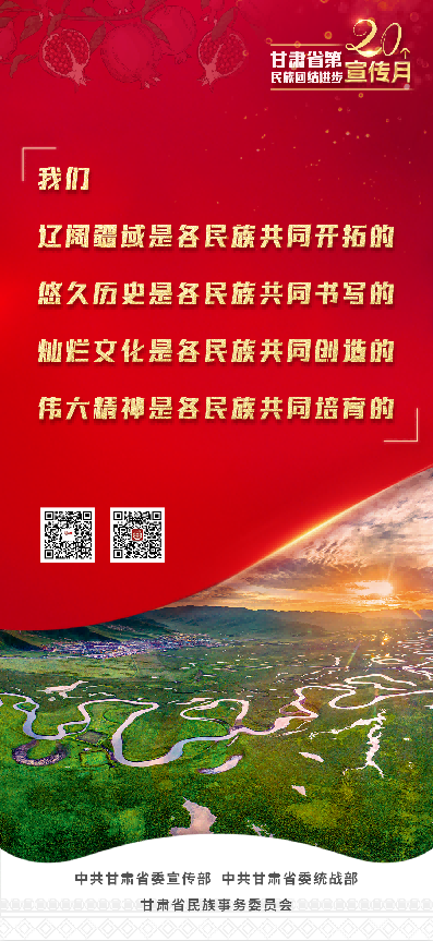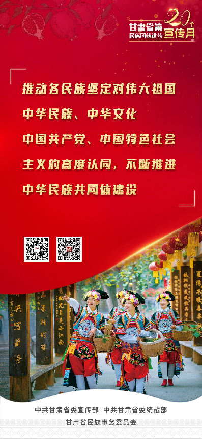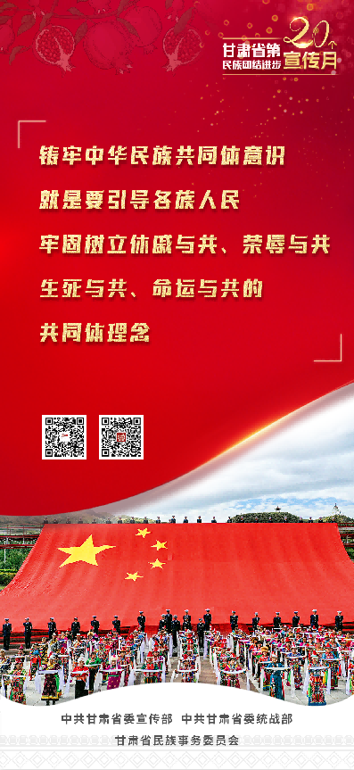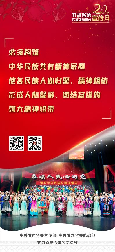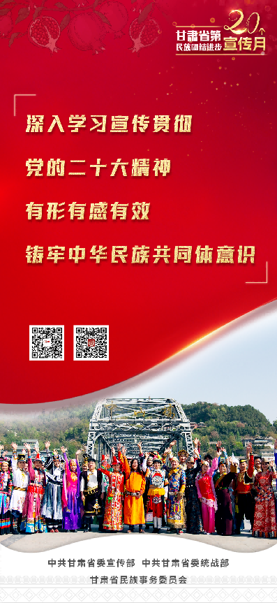 甘肃省第20个民族团结进步宣传月活动,以习近平新时代中国特色社会主义思想为指导,全面贯彻党的二十大和省第十四次党代会精神,持续深入学习贯彻习近平总书记关于加强和改进民族工作的重要思想和中央、省委民族工作会议精神,坚持因地制宜、分类实施,突出立体架构、多措并举,不断创新载体、搭建平台,有形有感有效开展铸牢中华民族共同体意识宣传教育,使“四个与共”的共同体理念更加深入人心,为全面建设社会主义现代化幸福美好新甘肃提供坚强思想保证和强大精神力量。