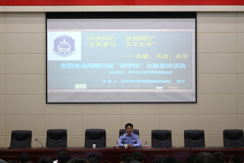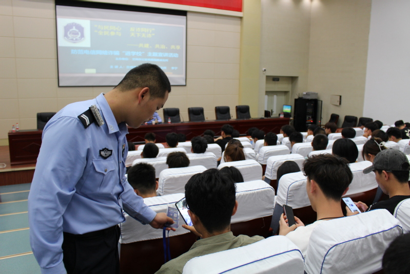 在会上,李宁警官以《与民同心反诈同行全民参与天下无诈》为主题,主要从“宋”钱花的诈蛋人生、网上购物超低价,贪小便宜吃大亏、假客服夺命来电,宋钱花不幸中招、山穷水尽中大奖,柳暗花明待何时、网络世界风险大,凡事去证不被骗等5个方面,告诉同学们同学们今后在各种场合我们都应提高警惕,不要有“贪婪之心”,遇到陌生短信电话、中奖信息、QQ求助、汇款等事情一定小心谨慎,仔细甄别,千万不要轻信麻痹和上当受骗,实在不能确定真假及时向110报警求助。