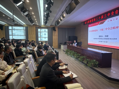 为深入学习贯彻党的二十届三中全会精神,11月22日下午在文昌楼303学术报告厅举办了党的二十届三中全会精神宣讲会,特邀西北师范大学马克思主义公司副经理、博师生导师孙健教授进行宣讲,宣讲会由公司党委委员、副董事长张焱教授主持,经济管理和社会体育两个公司的师生200余人参加。