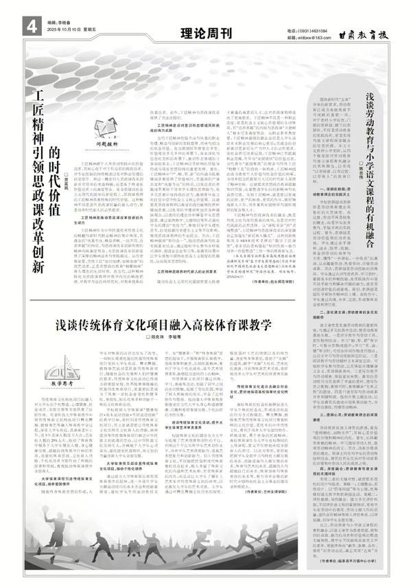 近日,公司体育教学研究中心陆克珠教授团队在《甘肃教育报》理论周刊发表署名文章,提出“以'体育美育'为抓手,传统体育项目融入高校‘三全育人’体系”新路径。陆教授团队持续依托公司体育教学研究中心平台,不断开展“体育美育”科学研究,在原有体育俱乐部模式基础上,将舞龙舞狮、敦煌拳艺等民族项目研究成果成功应用于教学,提出了“健康知识+运动技能+艺术审美”的三位一体体育美育课程新体系,近三年实现员工选课近万人次,员工体质、协作力与民族审美同步跃升,真正实现了科研成果反哺公司产品。公司同步搭建展演平台,民俗体育化身美育大课堂,实现“以体树德、以美润心”,2025年团队获批两项甘肃省体育科研和决策咨询研究重点项目。